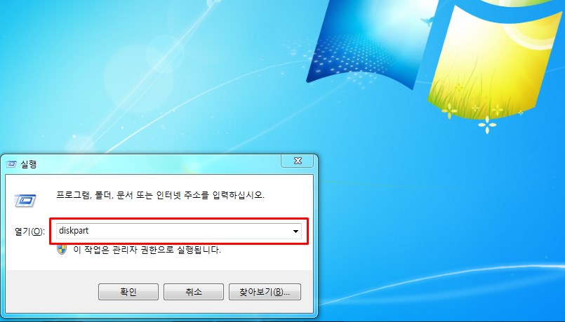 두번째 usb 쓰기금지 해제방법으로는 diskpart를 이용해 해결할 수 있습니다. 먼저, 윈도우키 + R키 단축키를 이용해서 실행창을 띄워줍니다. 그리고 열기 입력란에다가 diskpart라고 입력 후 확인을 눌러주면 되는데요. 그럼 diskpart 관련 콘솔창이 뜹니다. 이 창은 명령 프롬포트와 비슷한 형식으로 생겼습니다.