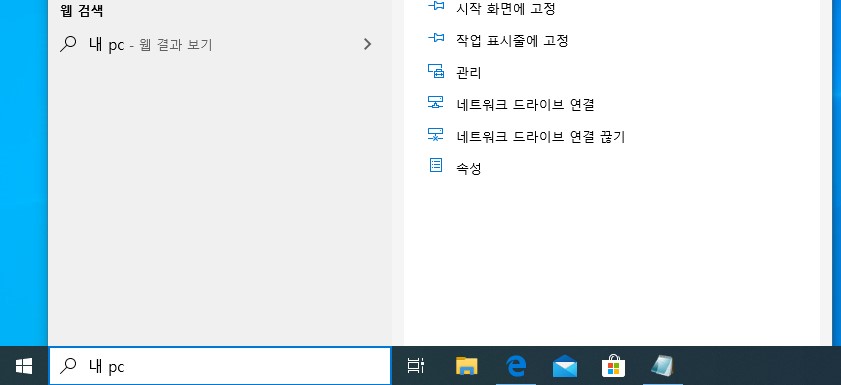 내 pc가 검색되는데 하위 메뉴에 열기, 시작화면에 고정, 작업표시줄에 고정, 관리, 네트워크 드라이브 연결, 네트워크 드라이브 연결 끊기, 속성이 나옵니다. 엔터를 한 번 더 치면 열기가 되는데, 시작화면에 고정은 이를 선택해주면 됩니다.